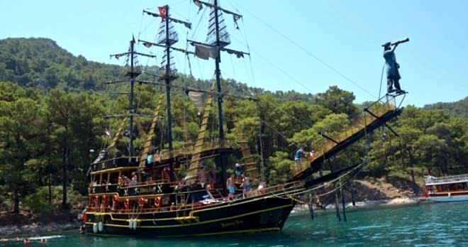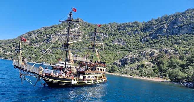 Marmaris Pirate Boat Trip takes place on a daily basis during the morning. Members of our team will pick you up from your hotel and drive you to the port, from where the boat departs. In total, this boat trip will take you to four different bays in order to swim, enjoy the serenity of the landscape and explore the area. During the cruise, participants can relax on the decks and enjoy sun bathing. Alternatively, the boat has an amazing variety of entertainment options for those who love to party and enjoy some drinks. Marmaris Pirate Boat Trip finishes during the afternoon. By that time, you will be transferred back to your hotel.